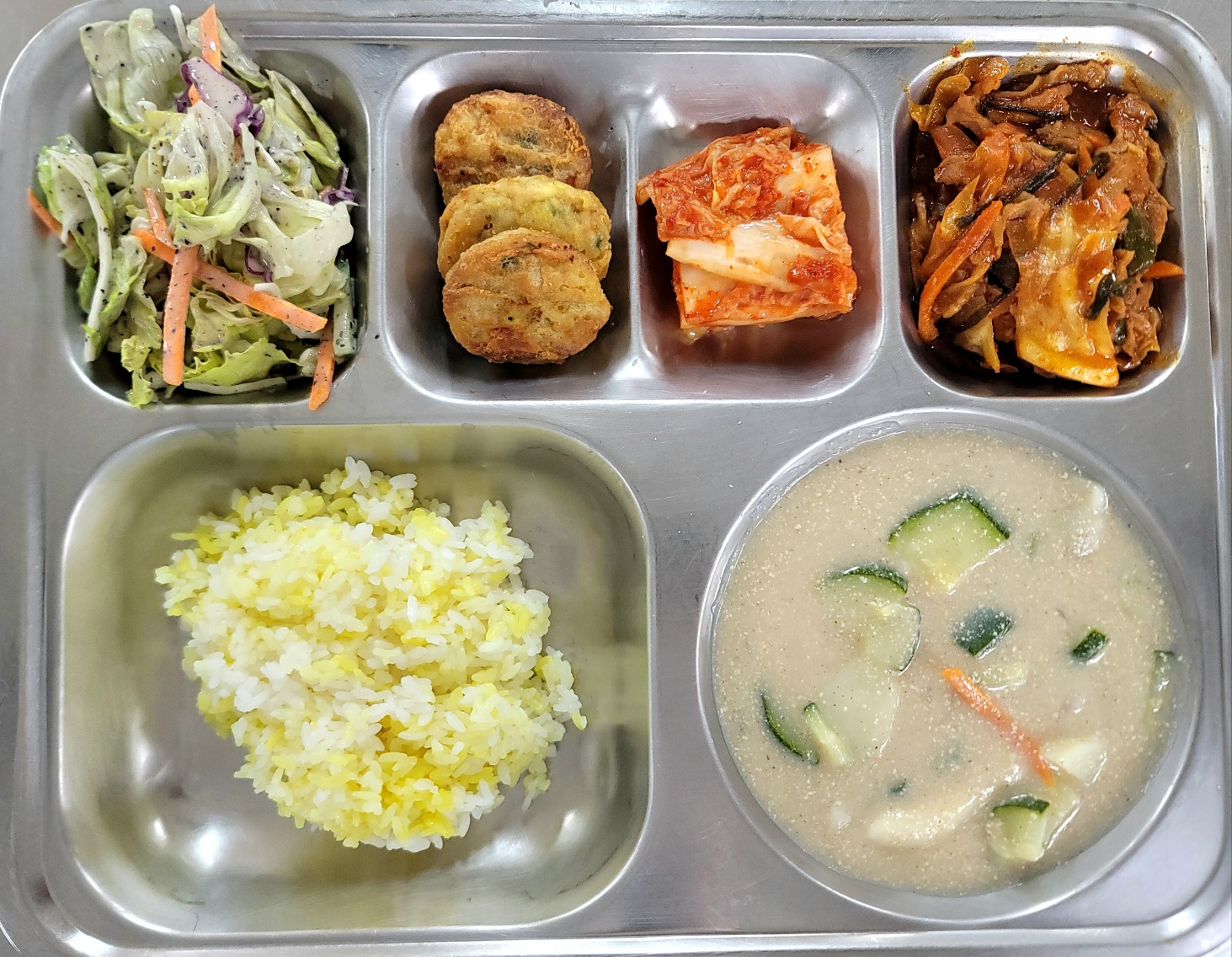 [석식] 강황쌀밥,들깨수제비국,오리고추장불고기,동그랑땡전,양상추샐러드/흑깨D,배추김치