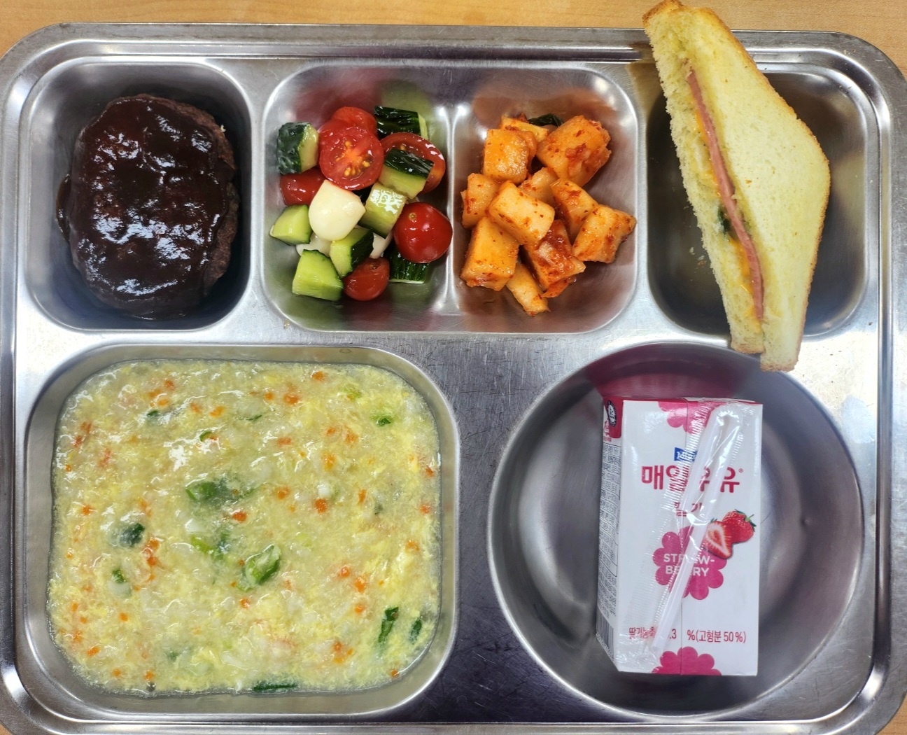 [조식] 계란죽,도토리떡갈비구이,토마토오이샐러드,대파크로크무슈,깍두기,딸기우유