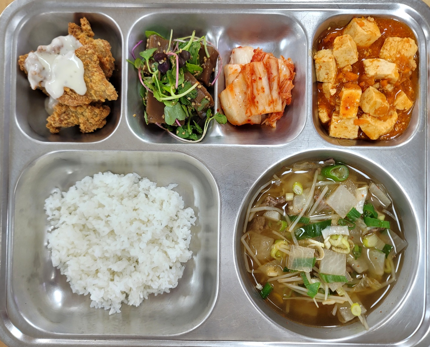 [석식] 친환경찹쌀밥,경상도식쇠고기무국,돼지갈비후라이드,마파두부,어린잎도토리묵무침,배추김치