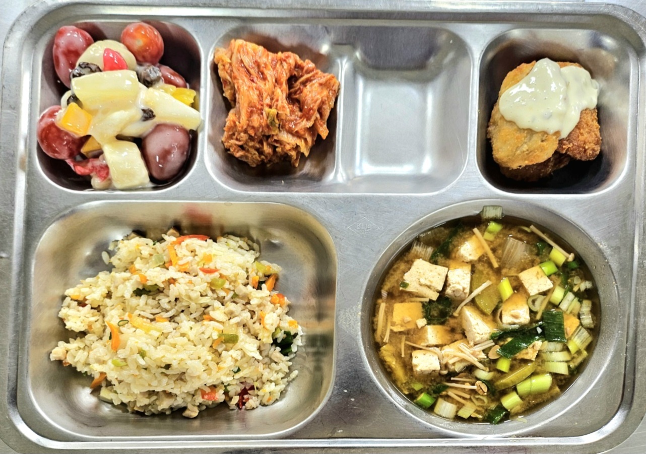 [조식] 햄야채볶음밥,팽이버섯된장국,명태미니커틀릿,과일샐러드(방토),배추김치