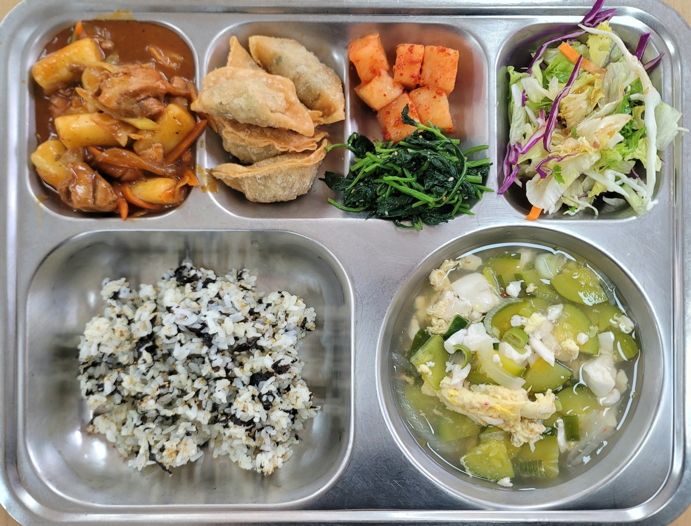 [중식] 후리카케김가루밥,애호박새우젓국,마라닭떡볶이,교자만두튀김,양상추샐러드/오리엔탈D,깍두기