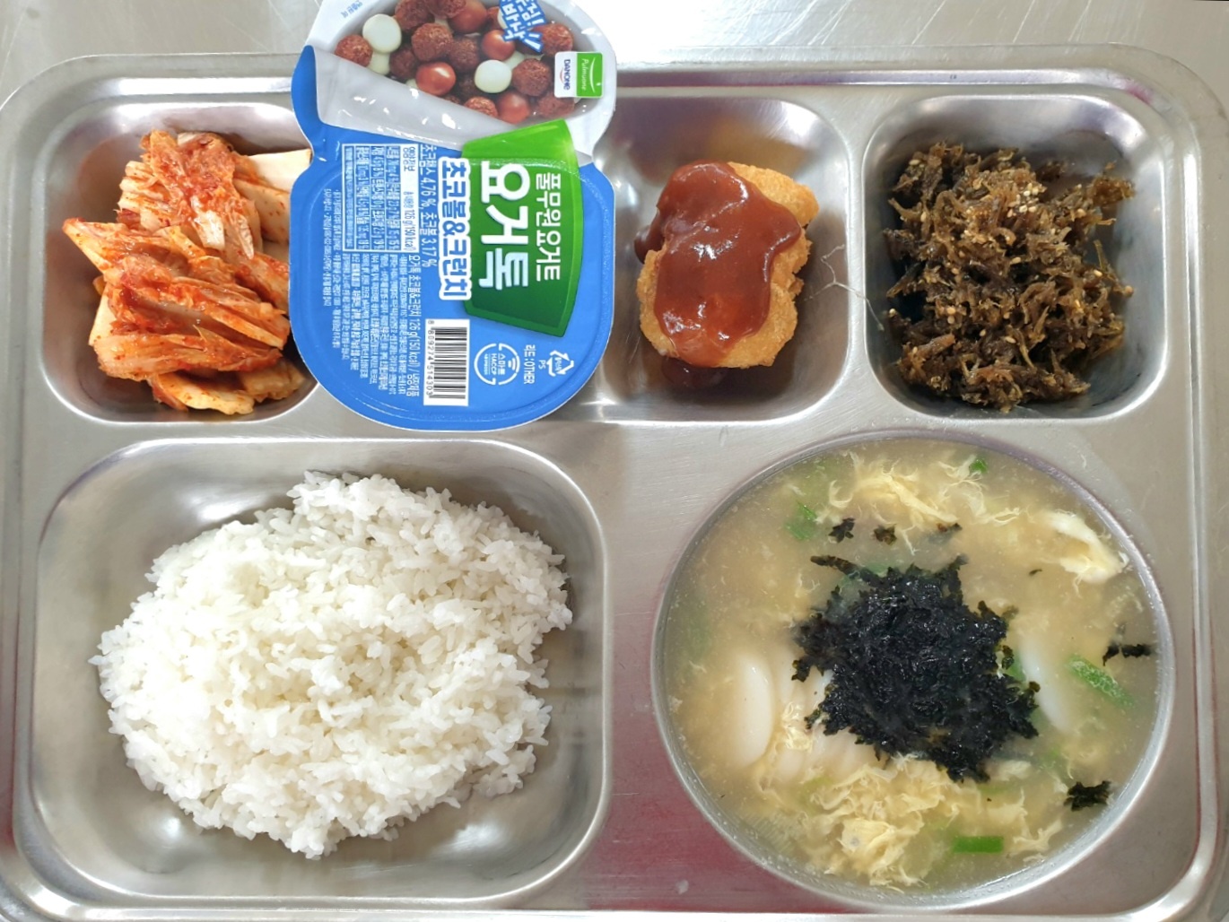[조식] 미니밥(자율),쇠고기떡국,미니블럭치즈돈까스/소스,일미간장채볶음,배추김치,요거톡&초코볼