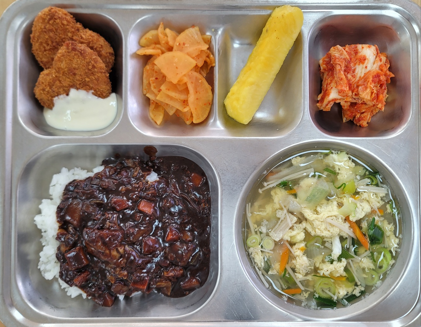 [중식] 채식짜장밥,팽이버섯계란국,코코넛하트연어까스,꼬들단무지무침,배추김치,파인애플