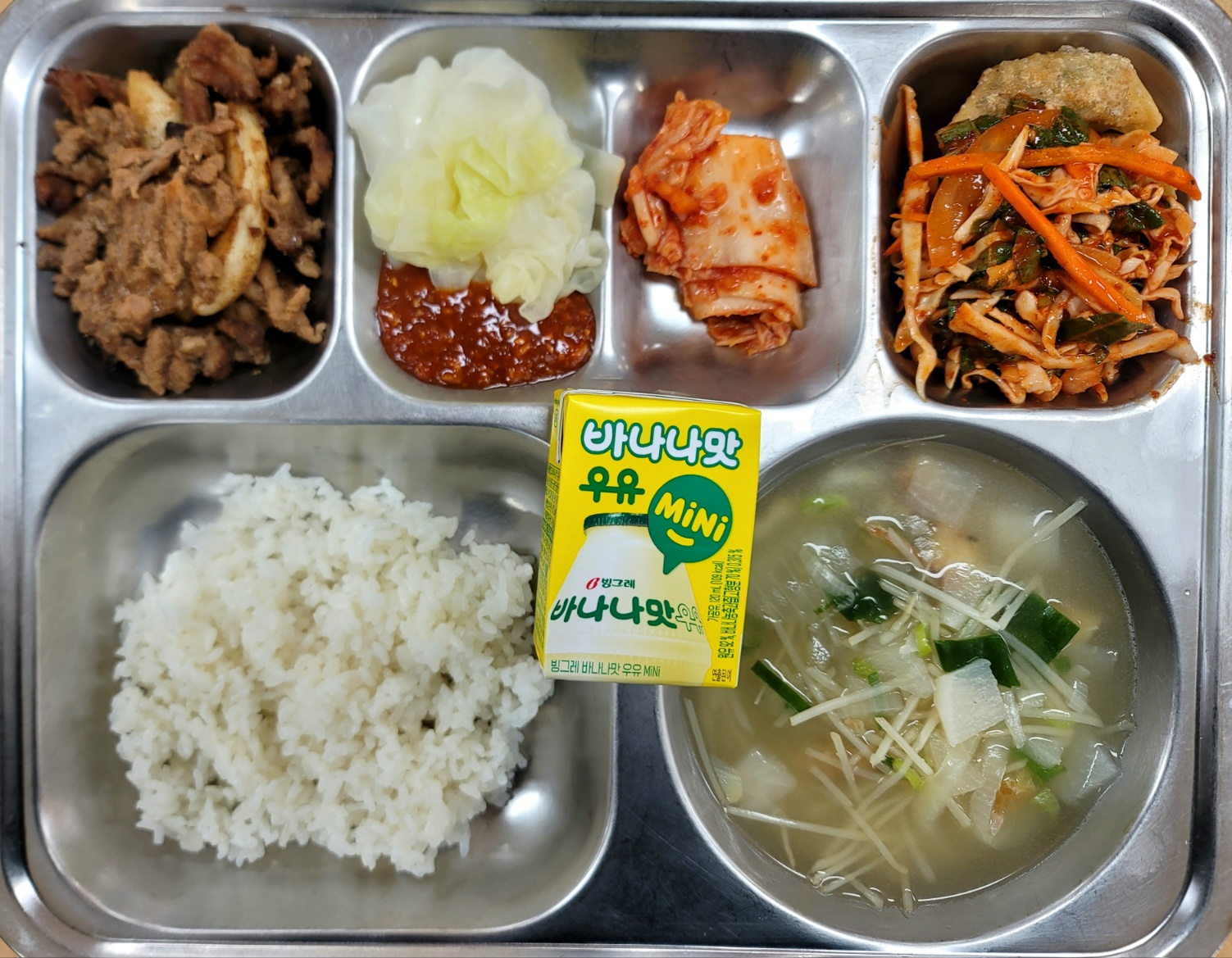 [석식] 친환경찹쌀밥,북어콩나물국,칼집순살돼지갈비맛구이,비빔만두,양배추쌈*쌈장(자율),배추김치,바나나우유