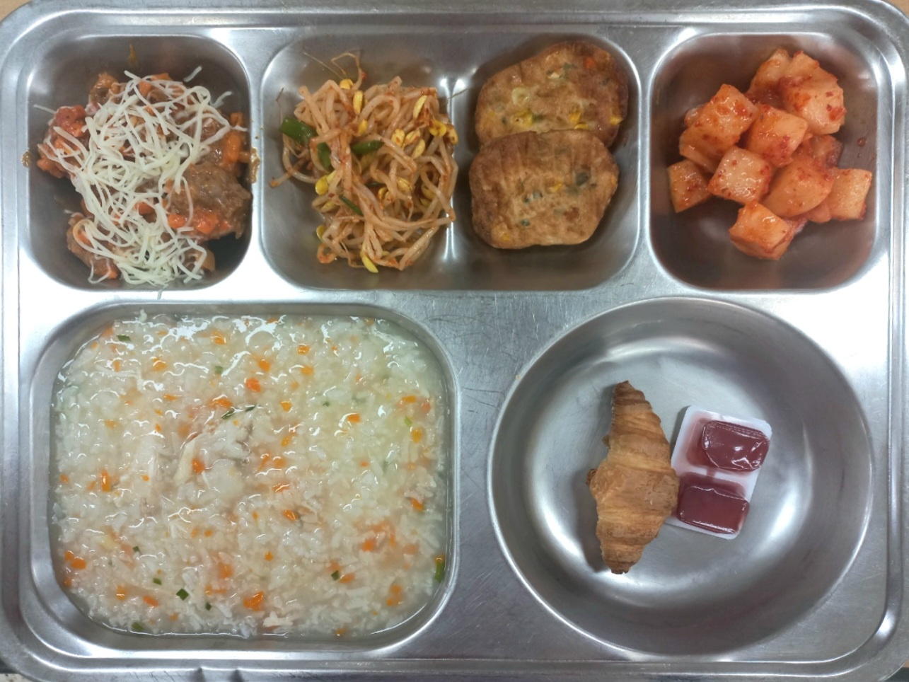 [조식] 영양닭야채죽,눈꽃로제미트볼,초당옥수수완자전,매콤콩나물무침,깍두기,미니크로아상*딸기쨈