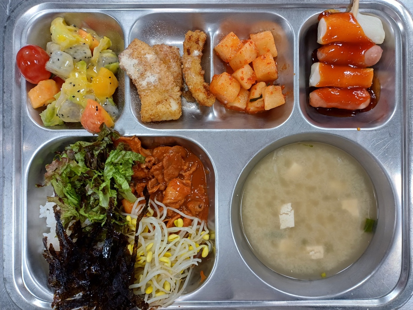 [석식] 돈육쭈꾸미덮밥,미소된장국,소떡소떡,크리스피오징어스틱,열대과일샐러드,깍두기