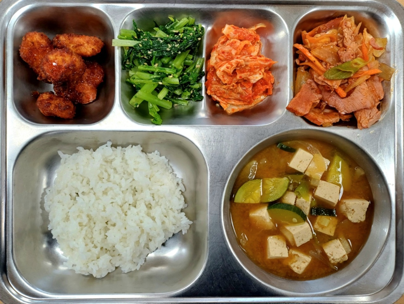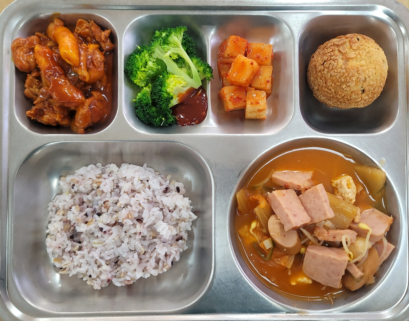 [중식] 친환경잡곡밥,부대찌개,맵코바치킨,브로콜리무침(자율),깍두기,달콤바삭찰보루빵