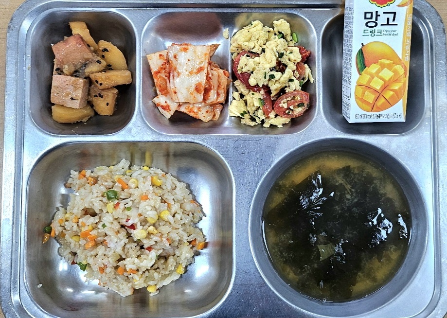 [조식] 새우볶음밥,미역장국,스팸감자조림,토마토달걀볶음,배추김치,망고드링크
