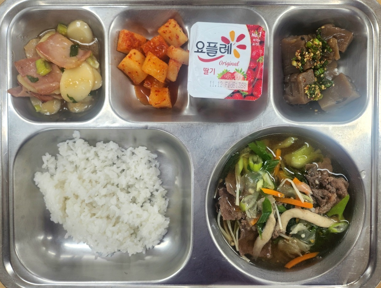 [조식] 친환경찹쌀밥,한우버섯전골*당면사리,떡베이컨간장조림,도토리묵&양념장,깍두기,딸기요거트