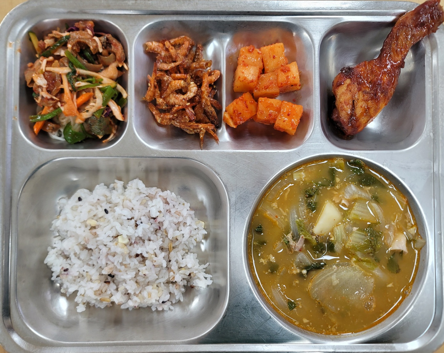 [석식] 친환경잡곡밥,순살등뼈감자탕,닭다리오븐구이,골뱅이소면무침,마늘쫑건새우볶음,깍두기