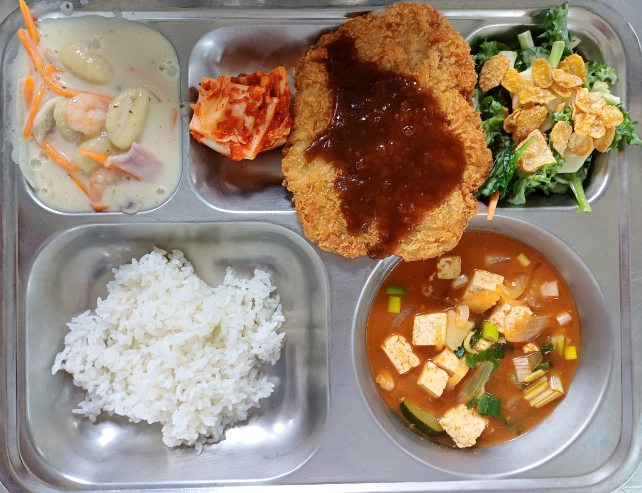 [석식] 친환경찹쌀밥,돈육고추장찌개,추억의경양식돈가스,크림소스감자뇨끼,시리얼치커리샐러드,배추김치