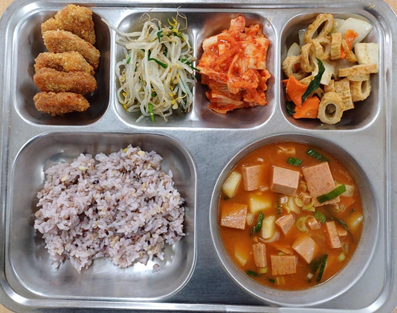[조식] 친환경잡곡밥,스팸감자짜글이찌개,크리스피돈강정,부들어묵볶음,부추숙주나물무침,배추김치