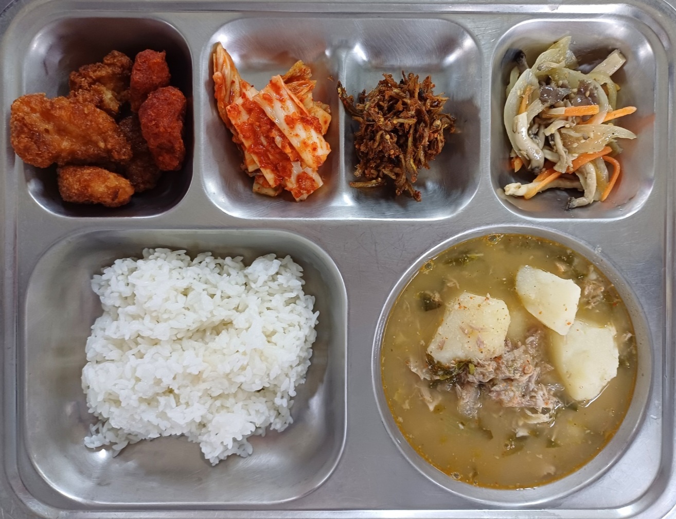[석식] 친환경찹쌀밥,순살등뼈감자탕,순살반반치킨,매콤멸치볶음,애느타리버섯볶음(자율),배추김치