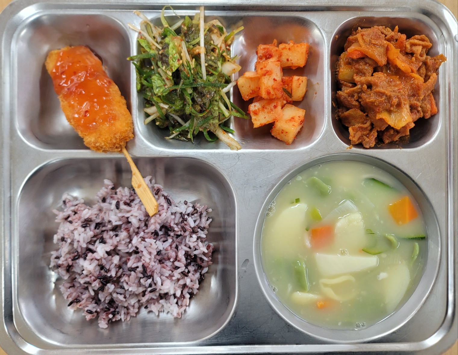 [중식] 찹쌀흑미밥,삼색감자수제비국,고추장불고기,통새우꼬치*칠리S,상추파겉절이,깍두기
