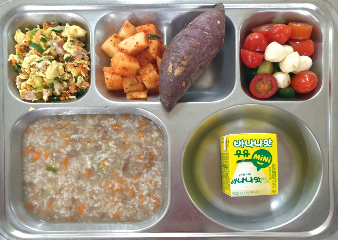 [조식] 쇠고기야채죽,햄스크램블에그,토마토오이샐러드,깍두기,바나나우유,군고구마