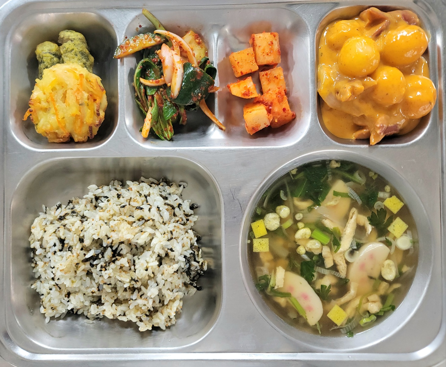 [석식] 돈육주꾸미덮밥,근대된장국,모듬전,참나물무침,배추김치,멋있어!망고C주스