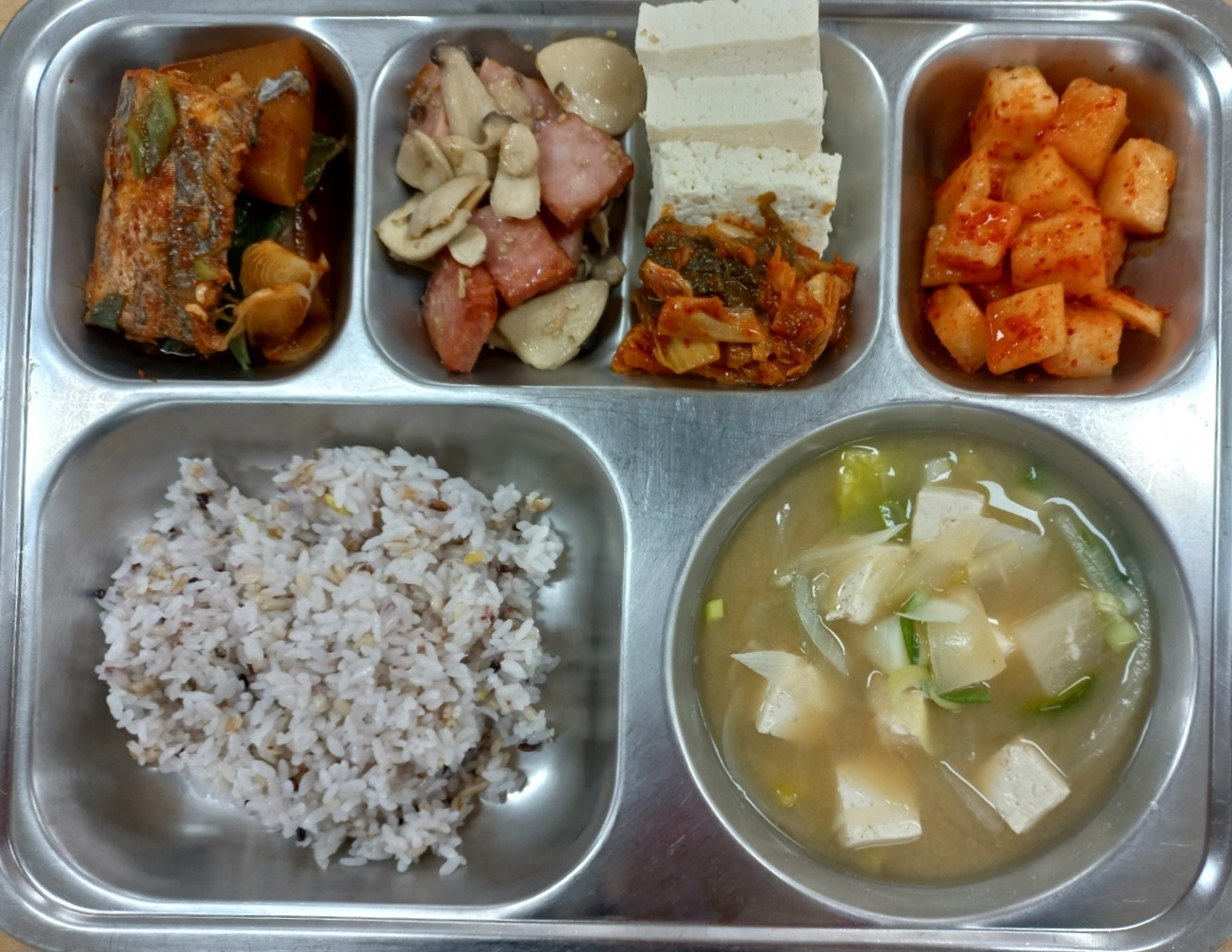 [조식] 친환경잡곡밥,된장찌개,갈치무조림,햄새송이볶음,온두부&볶음김치,깍두기