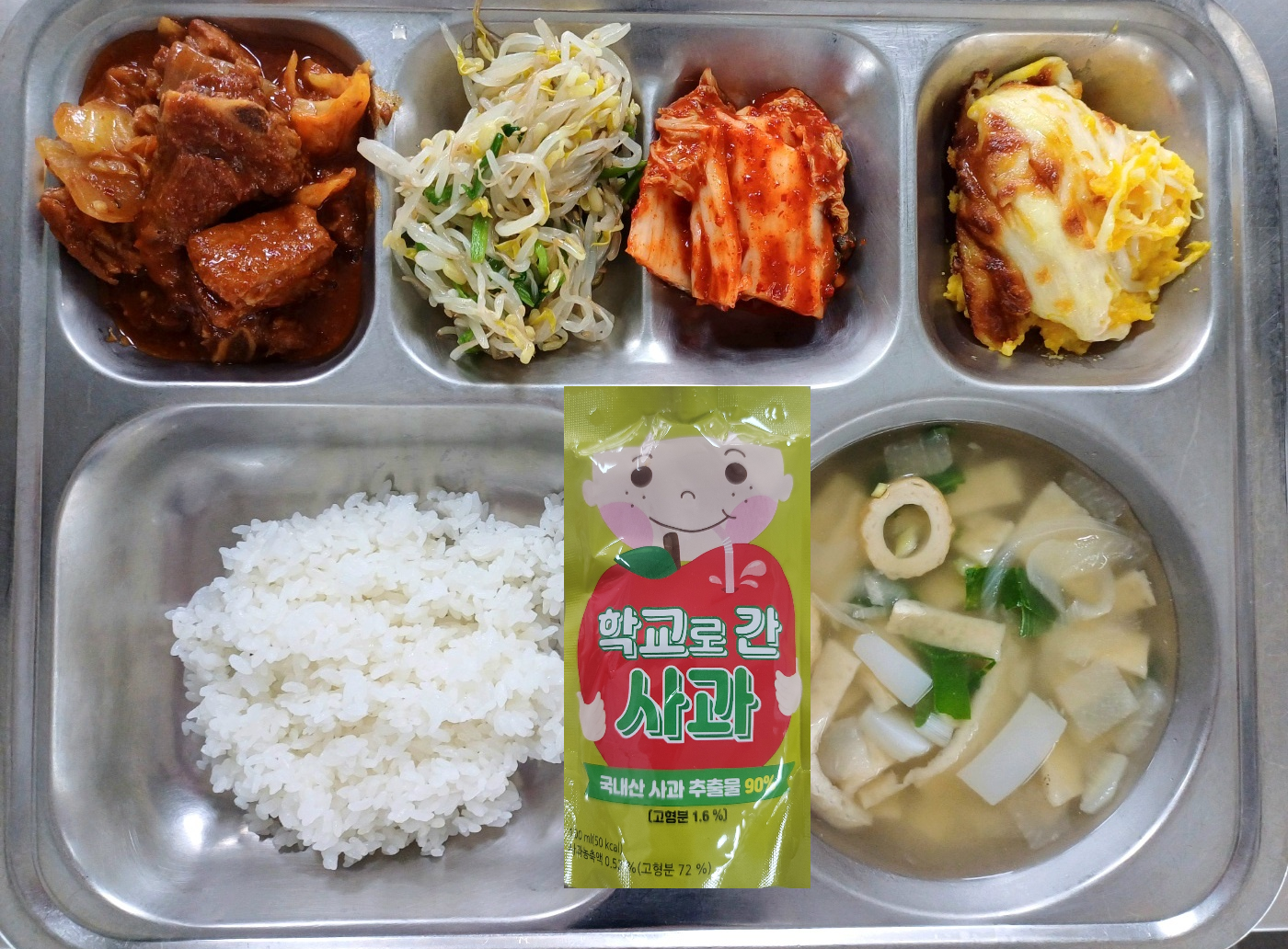 [중식] 친환경찹쌀밥,모듬어묵국,동인동식찜갈비,고구마치즈그라탕,미나리숙주나물무침,배추김치,학교로간주스