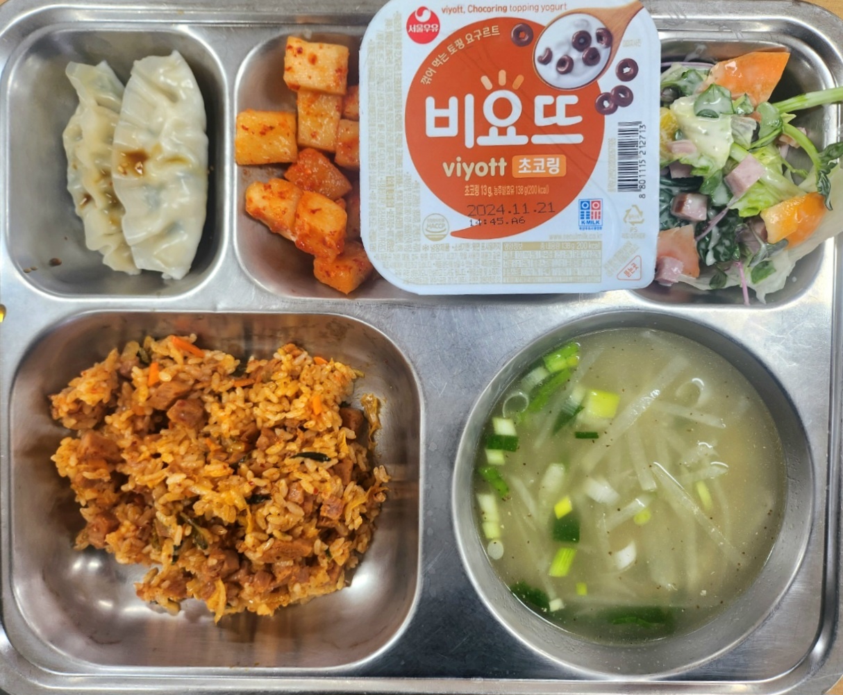 [조식] 김치스팸볶음밥,들깨무채국,왕교자찐만두,비타민샐러드,깍두기,비요뜨