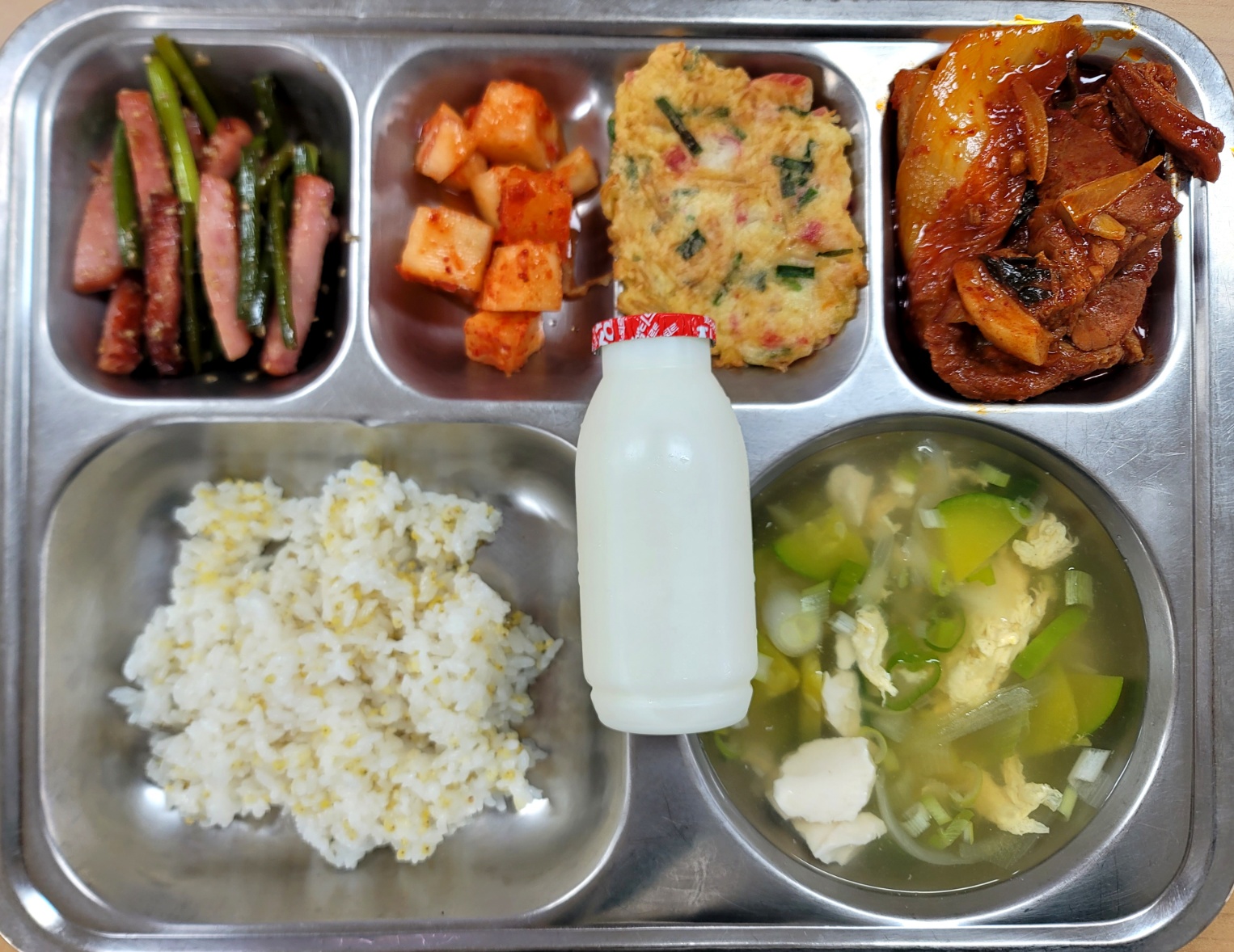 [석식] 기장밥, 애호박새우젓국,돼지고기김치찜,팽이버섯계란전,마늘쫑햄볶음,깍두기,파스퇴르요구르트