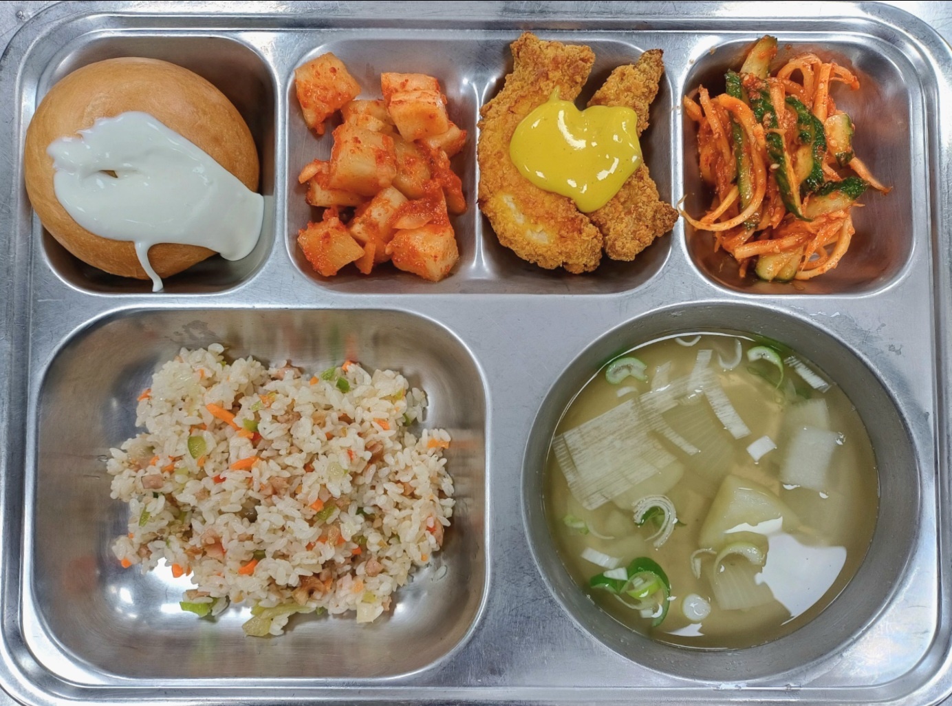 [조식] 햄야채볶음밥,감자국,치킨텐더*머스터드,도라지오이무침(자율),깍두기,베이글*크림치즈