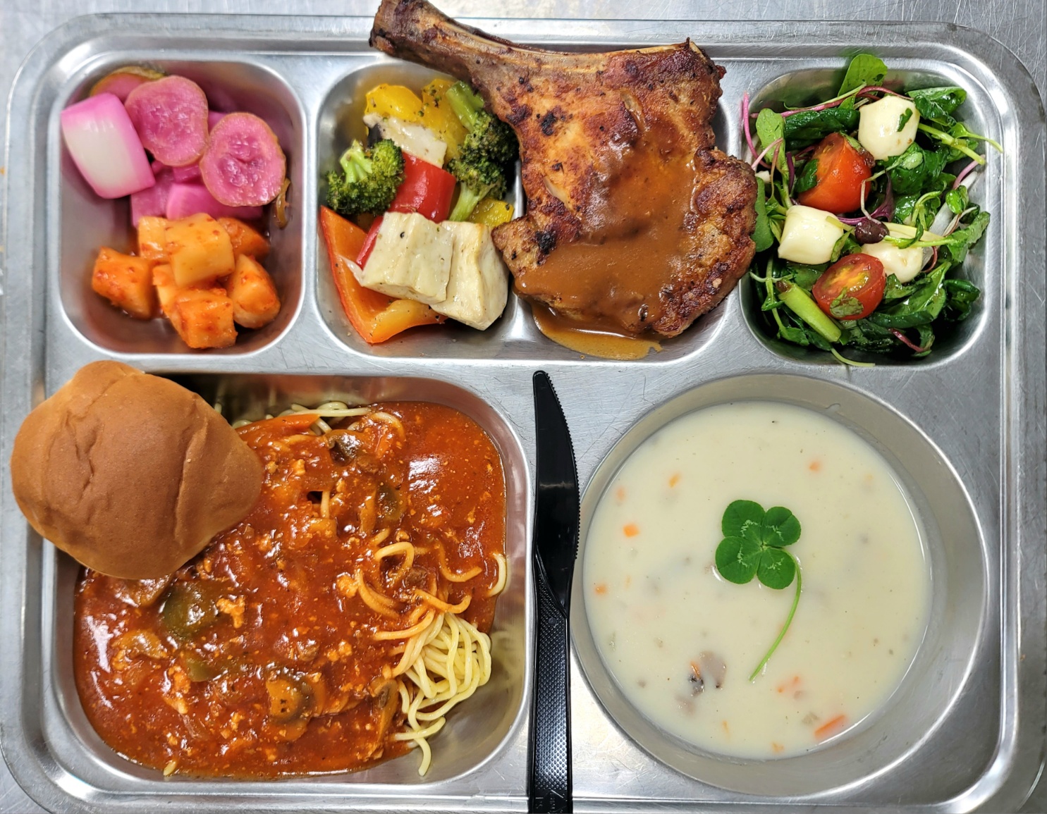 [중식] 토마토스파게티,양송이크림스프,돈마호크,구운채소,수제피클,깍두기,모닝빵