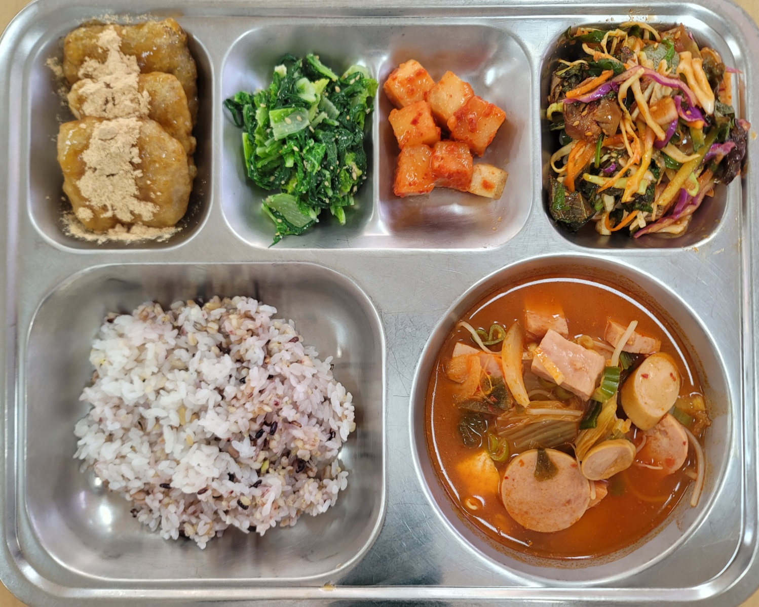 [중식] 친환경잡곡밥,부대찌개,콩코물꿔바로우,골뱅이소면무침,단배추들깨무침(자율),깍두기