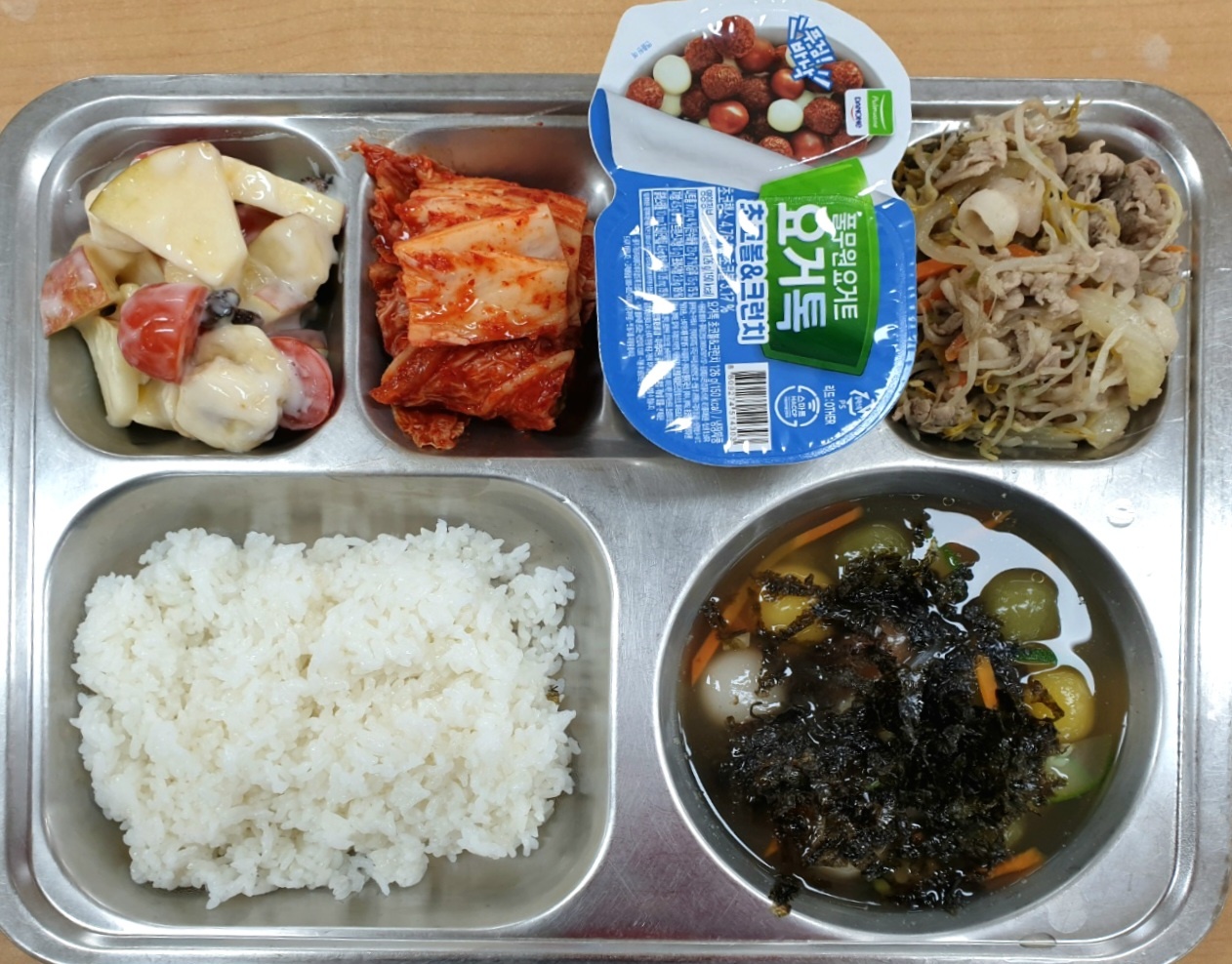[조식] 친환경찹쌀밥,삼색감자옹심이국,대패삼겹숙주볶음,과일샐러드(방토),배추김치,요거톡&초코볼