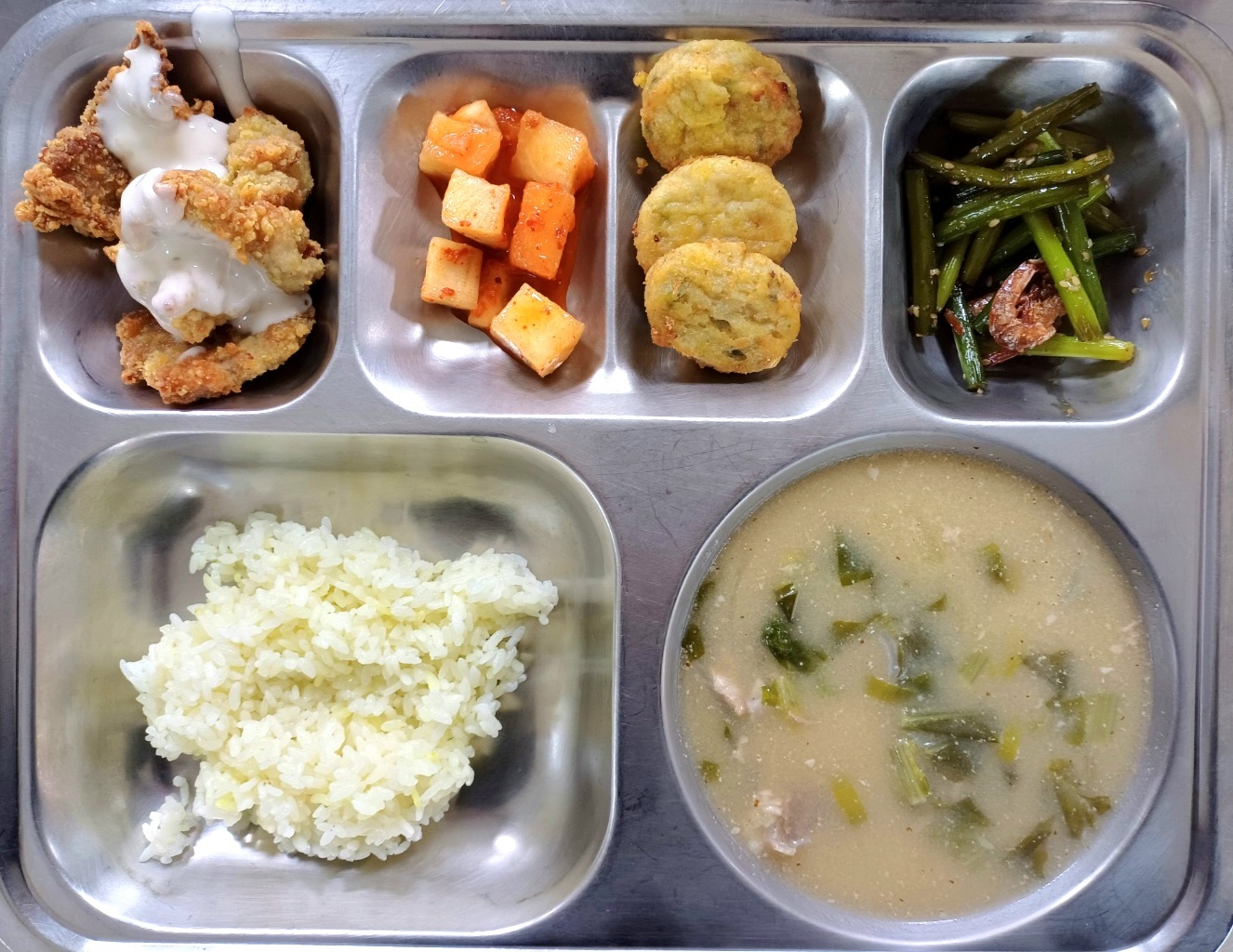 [석식] 강황쌀밥,사골우거지국,돼지갈비후라이드,동그랑땡전,마늘쫑건새우볶음,깍두기