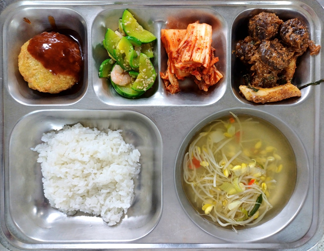 [석식] 친환경찹쌀밥,홍초콩나물국,멘츠카츠/소스,순대야채볶음,새우살호박볶음,배추김치