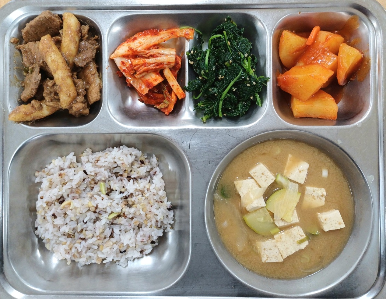 [조식] 친환경잡곡밥,두부된장국,칼집순살돼지갈비맛구이,고추장감자조림,깨순나물(자율),배추김치
