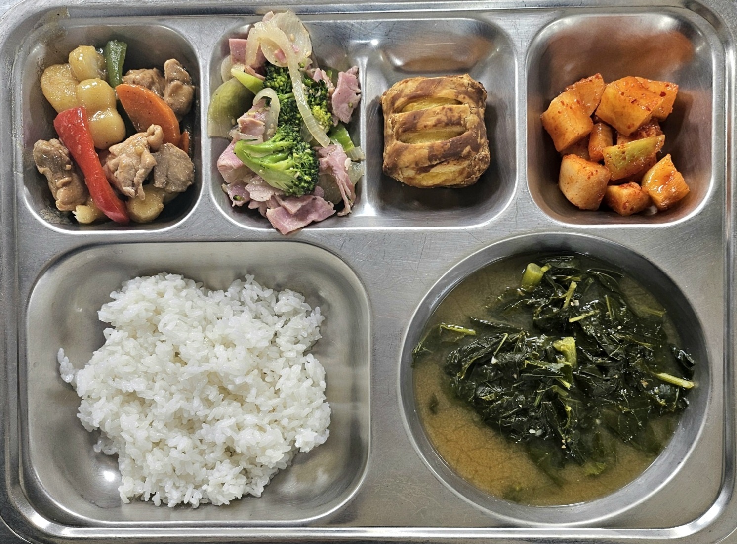 [조식] 친환경찹쌀밥,아욱국,닭살간장조림,브로콜리베이컨볶음,깍두기,미니슈크림파이