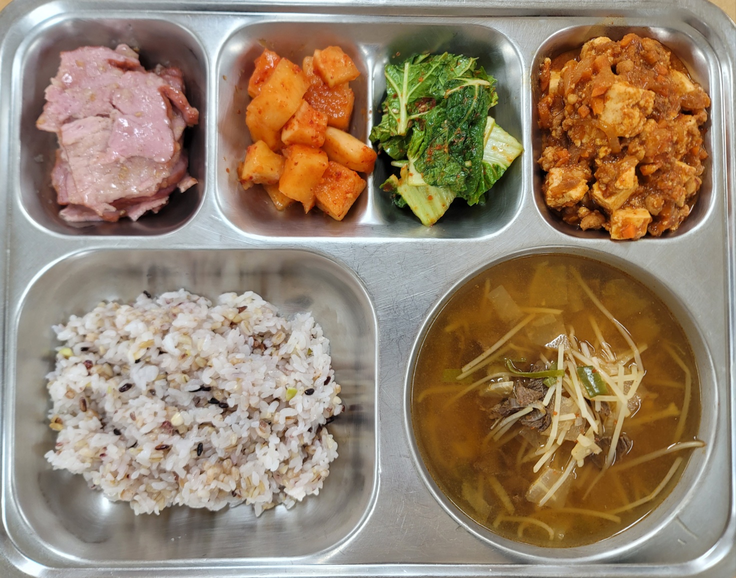 [석식] 친환경잡곡밥,경상도식쇠고기무국,버터갈릭순살바비큐,마파두부,쌈추겉절이,깍두기