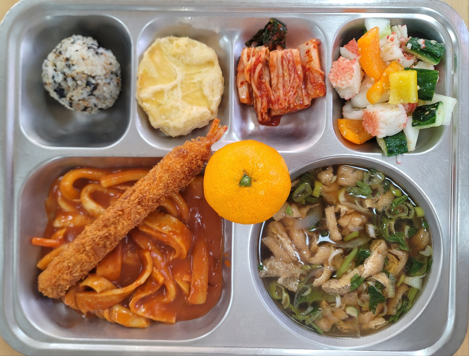 [중식] 미니주먹밥,가쓰오장국,후루룩밀떡볶이,롱새우튀김&고구마튀김,오이꽃맛살냉채,배추김치,귤