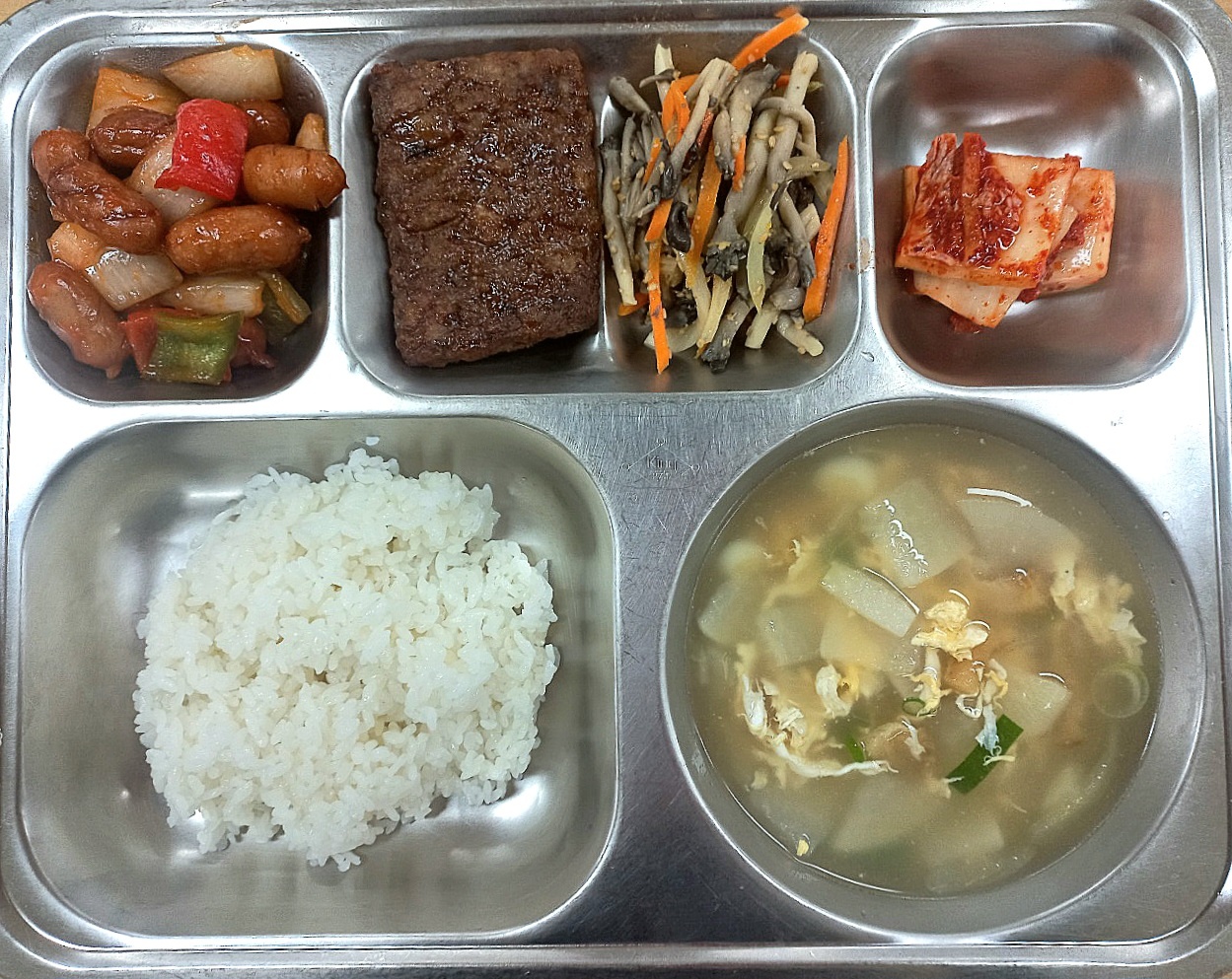 [조식] 친환경찹쌀밥,황태계란국,남도떡갈비,비엔나야채볶음*케첩,애느타리버섯볶음(자율),배추김치