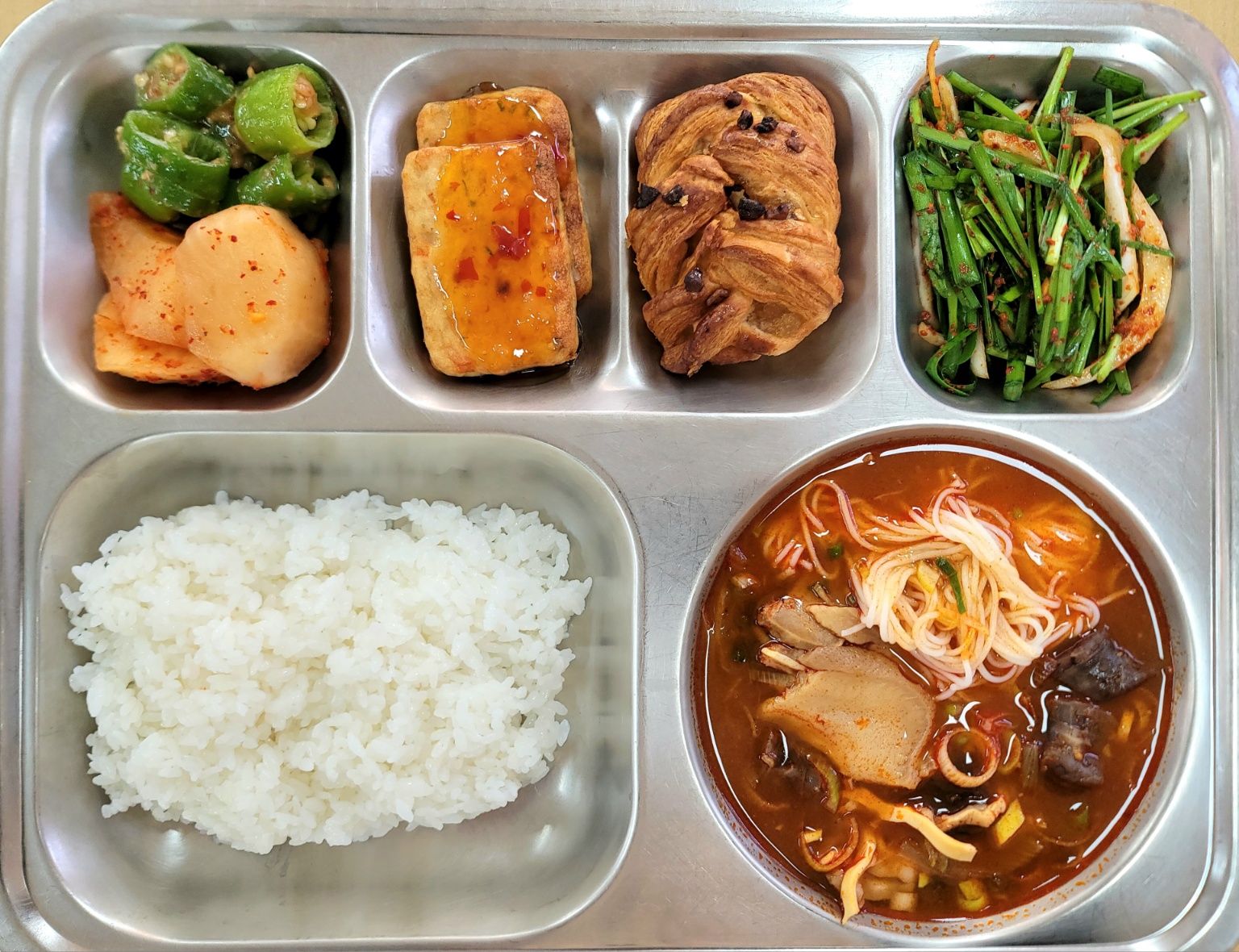 [중식] 친환경찹쌀밥,사골짬뽕순대국밥,달고기두부전,아삭고추된장무침(자율),부추겉절이,섞박지,메이플피칸파이