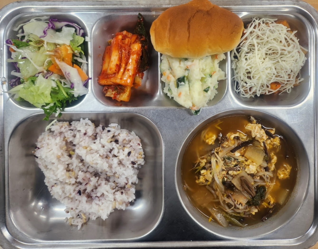 [조식] 친환경잡곡밥,닭개장,눈꽃로제미트볼,감자범벅*모닝빵,양상추샐러드/오리엔탈D,배추김치