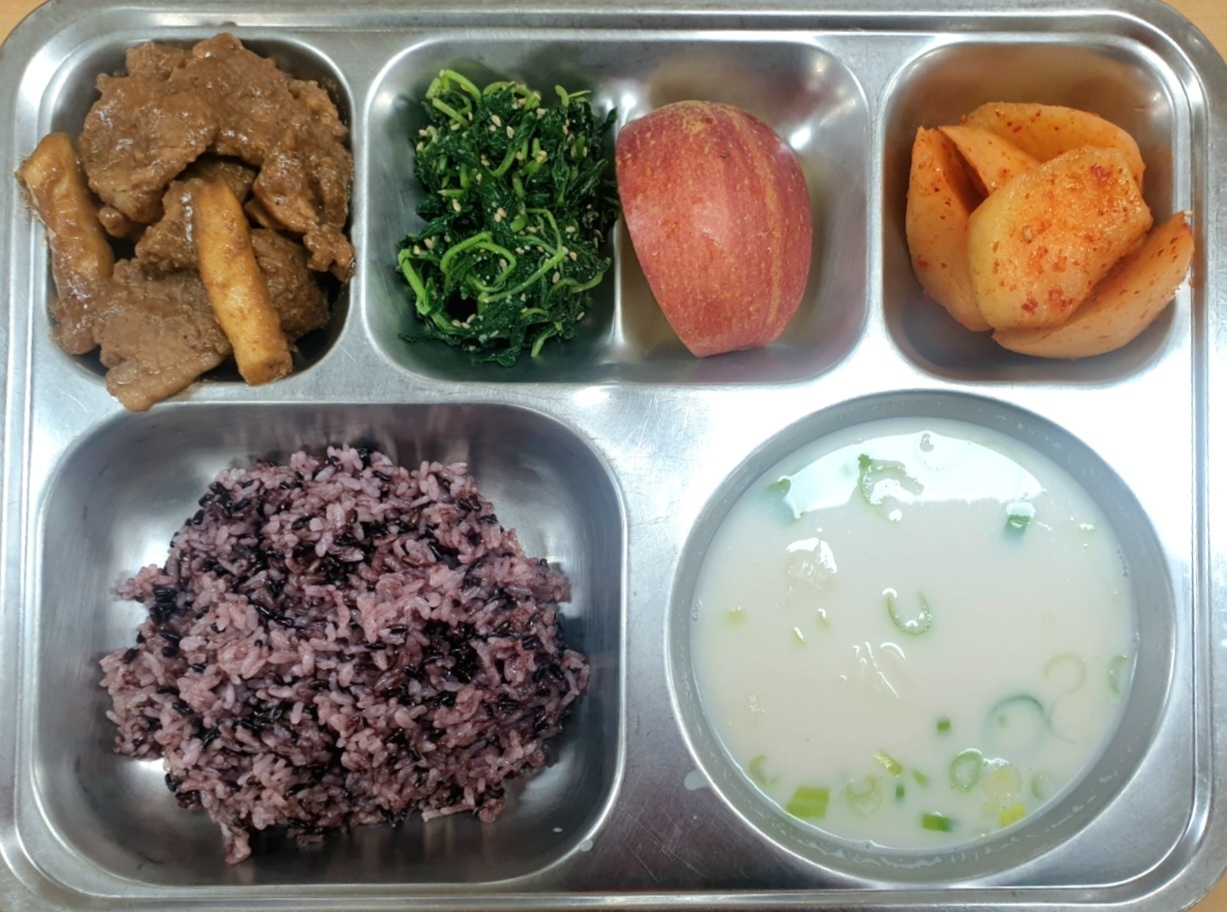 [조식] 찹쌀흑미밥,한우사골곰탕*소면,칼집순살돼지갈비맛구이,깨순나물,섞박지,사과