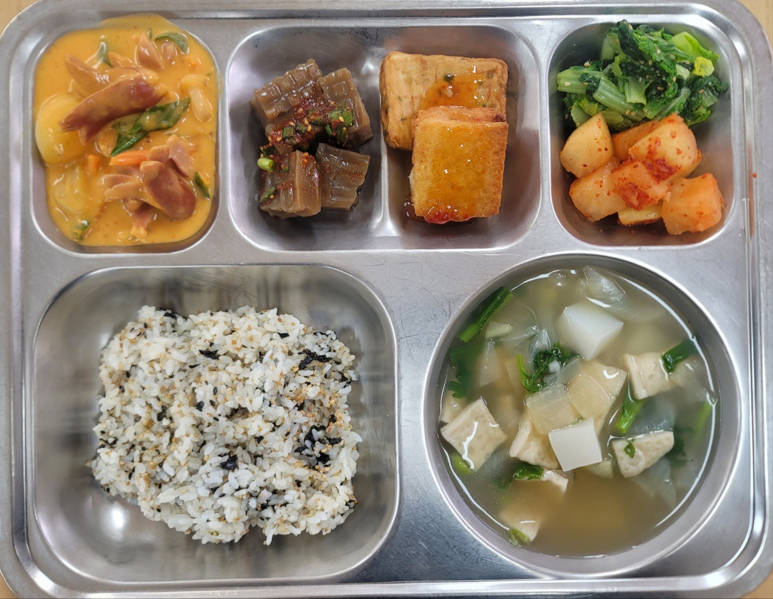 [중식] 후리카케김가루밥,모듬어묵국,로제치즈쏙옹볶이,멘보샤&어두부전,도토리묵&양념장,단배추나물(자율),깍두기