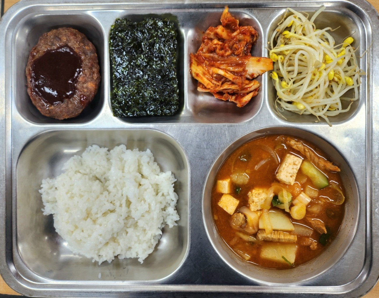 [조식] 친환경찹쌀밥,돈육고추장찌개,도토리떡갈비구이,콩나물무침,곱창돌김,배추김치