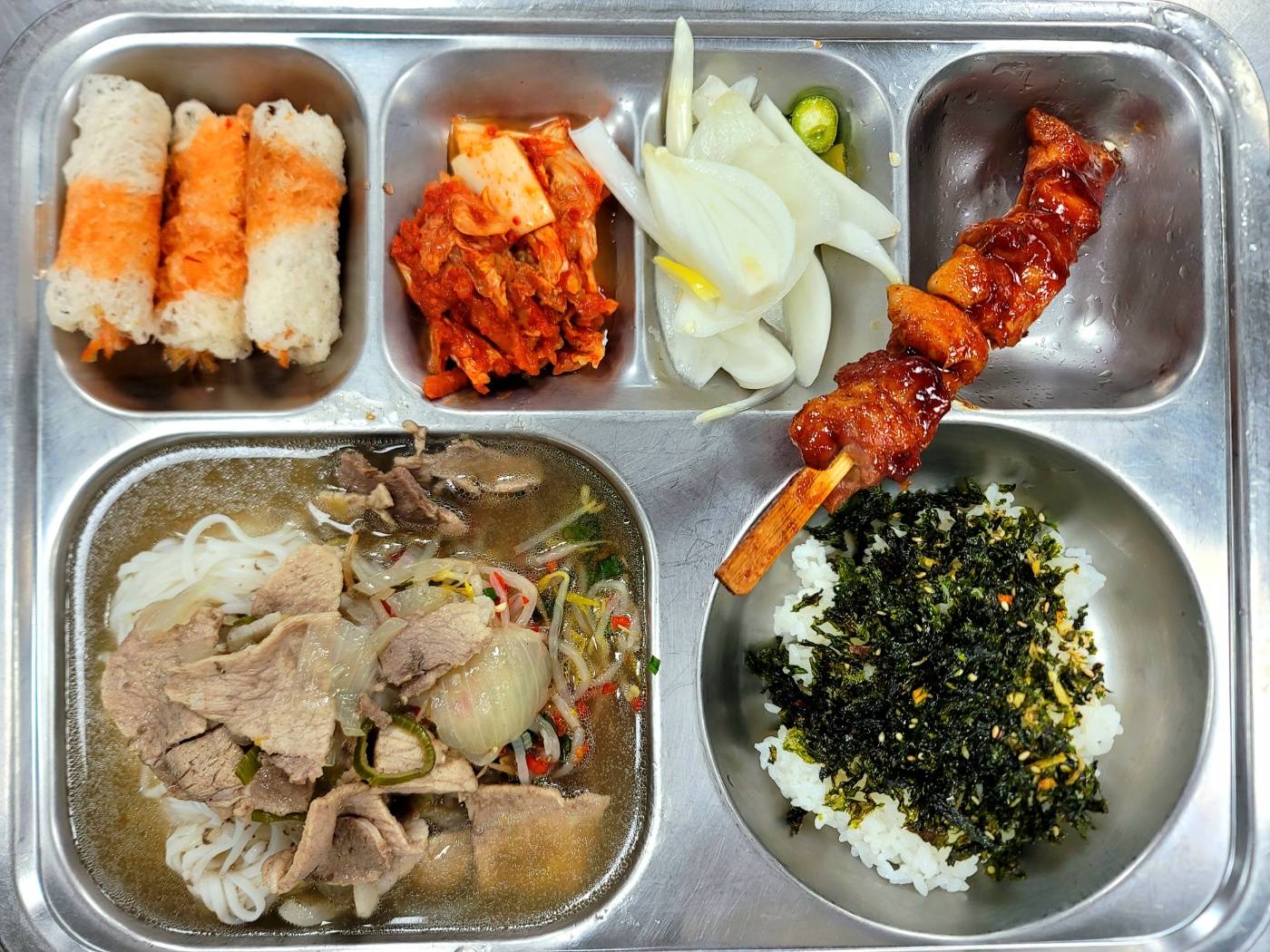 [석식] 미니밥*파래자반(자율),용남쌀국수,매콤닭꼬치,통새우짜조롤,양파초절임(자율),배추김치