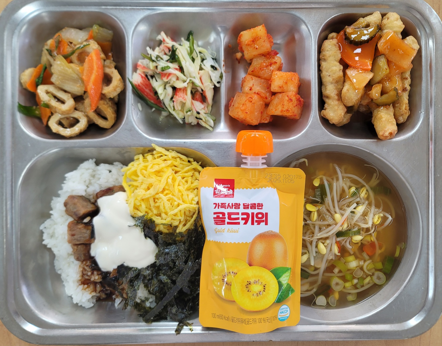 [중식] 떡갈비마요덮밥,얼큰콩나물국,파인베리찹쌀등심탕수육,부들어묵볶음,해초샐러드,깍두기,골드키위주스