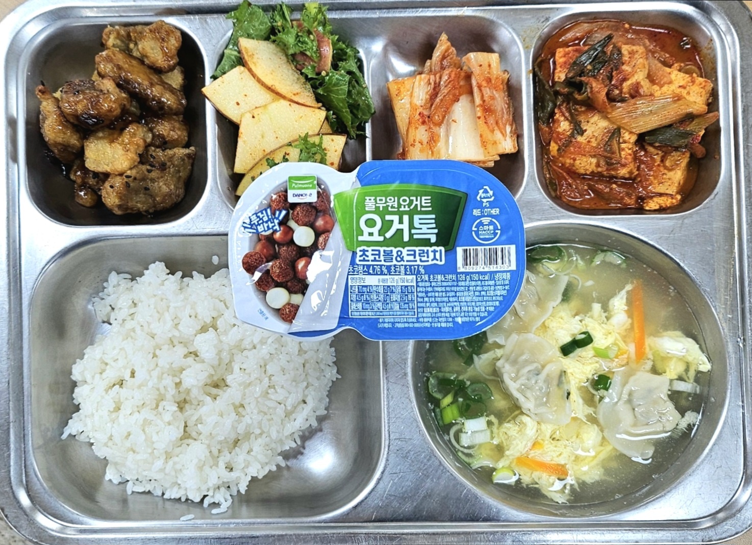 [조식] 친횐경찹쌀밥,물만두국,순살코다리강정,두부조림,치커리사과무침,배추김치,요거톡&초코볼