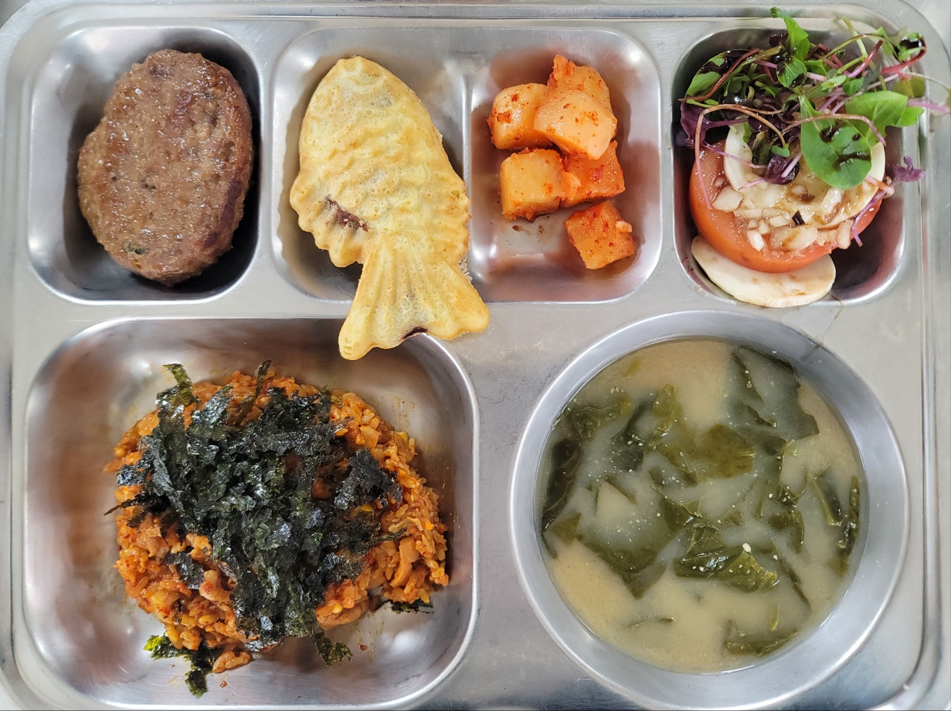 [중식] 닭살야채볶음밥,시금치된장국,알밤콕과일떡갈비,카프레제샐러드,깍두기