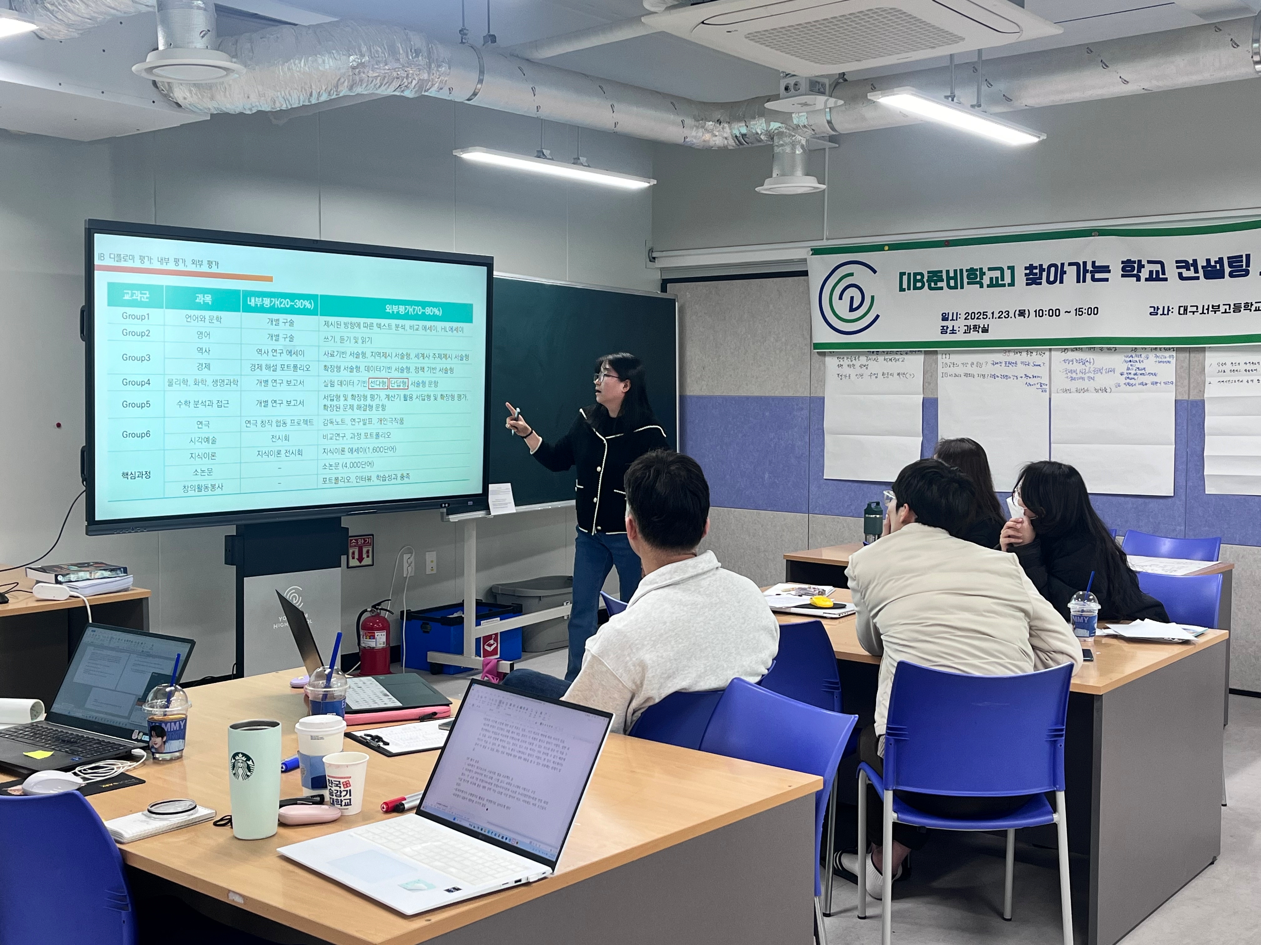 대구 서부고 DP과정을 운영하시는 코디 선생님과 부장 선생님께서 본교 리더팀 교원을 대상으로 IB 수업과 평가와 관련된 내용들에 대해 연수를 진행해주셨습니다.