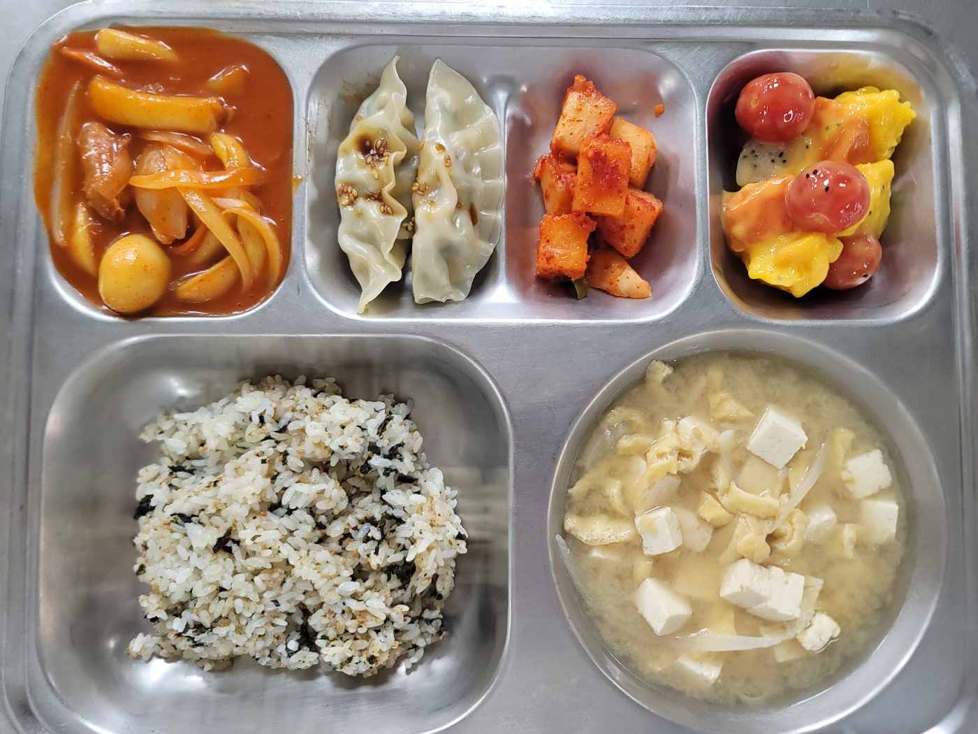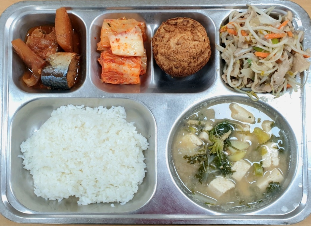 [조식] 친환경찹쌀밥,냉이된장찌개,대패삼겹숙주볶음,고등어무조림(자율),배추김치,달콤바삭찰보루빵