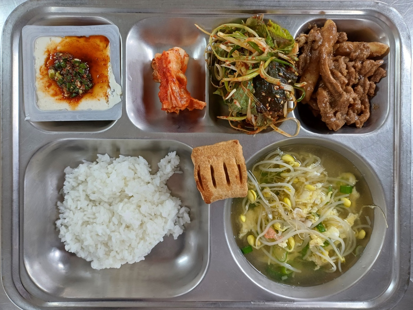 [석식] 후리카케김가루밥,유부장국,매콤로제떡볶이,왕교자찐만두,열대과일샐러드,깍두기