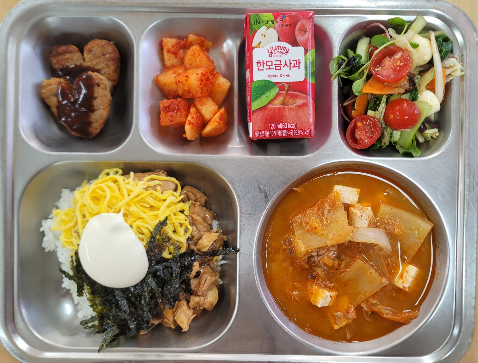 [중식] 치킨데리야끼마요덮밥,참치김치찌개,하트미니함박,토마토보토치니샐러드,깍두기,사과한모금