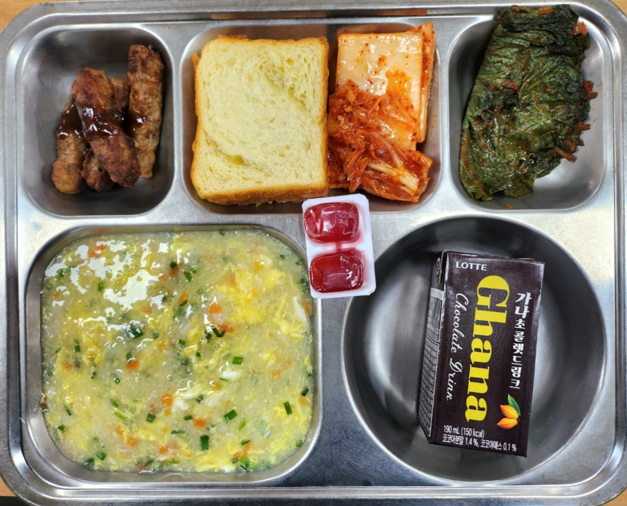 [조식] 계란죽,떡갈비스틱구이,양념깻잎지,배추김치,데니쉬조각식빵*딸기쨈,초코우유