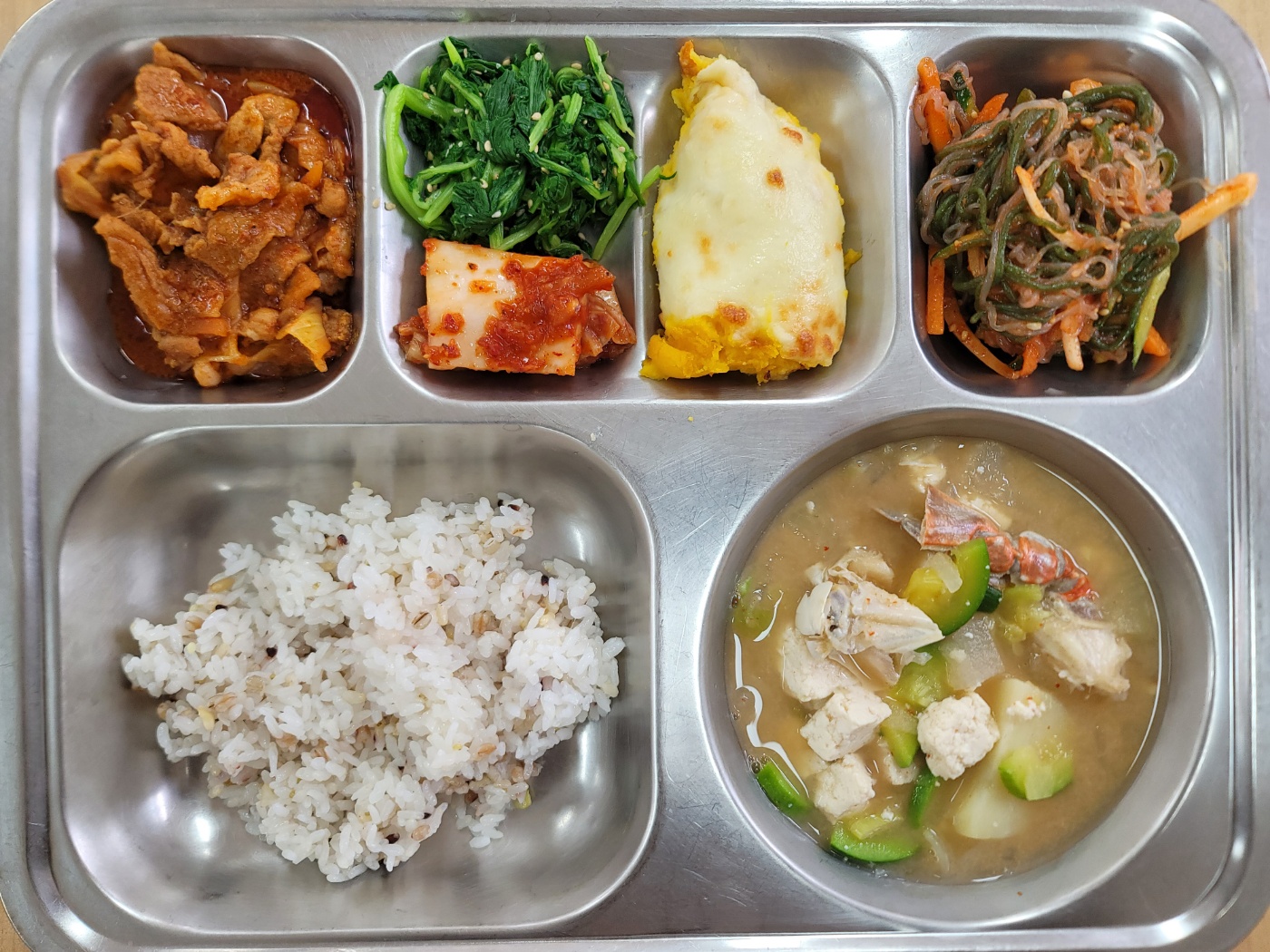 [중식] 친환경잡곡밥, 꽃게두부된장국, 고구마치즈그라탕, 유채나물(자율), 실곤약초무침, 고추장불고기, 배추김치